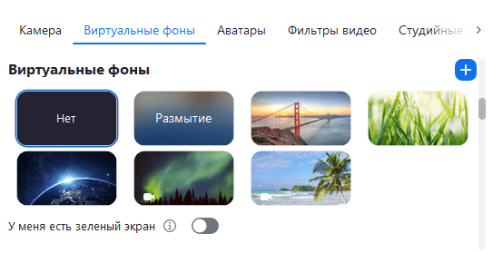 Виртуальные фоны. Эта функция позволяет заменить реальный фон пользователя на любое изображение или видео. Например, можно выбрать эффект «Размытие», который немного скроет обстановку комнаты пользователя. Помимо стандартных фонов можно загрузить собственный, нажав на значок «+». У виртуальных фонов есть недостаток — на границе с изображением пользователя появляются мерцающие края, где фон просвечивается и видно реальную обстановку комнаты.