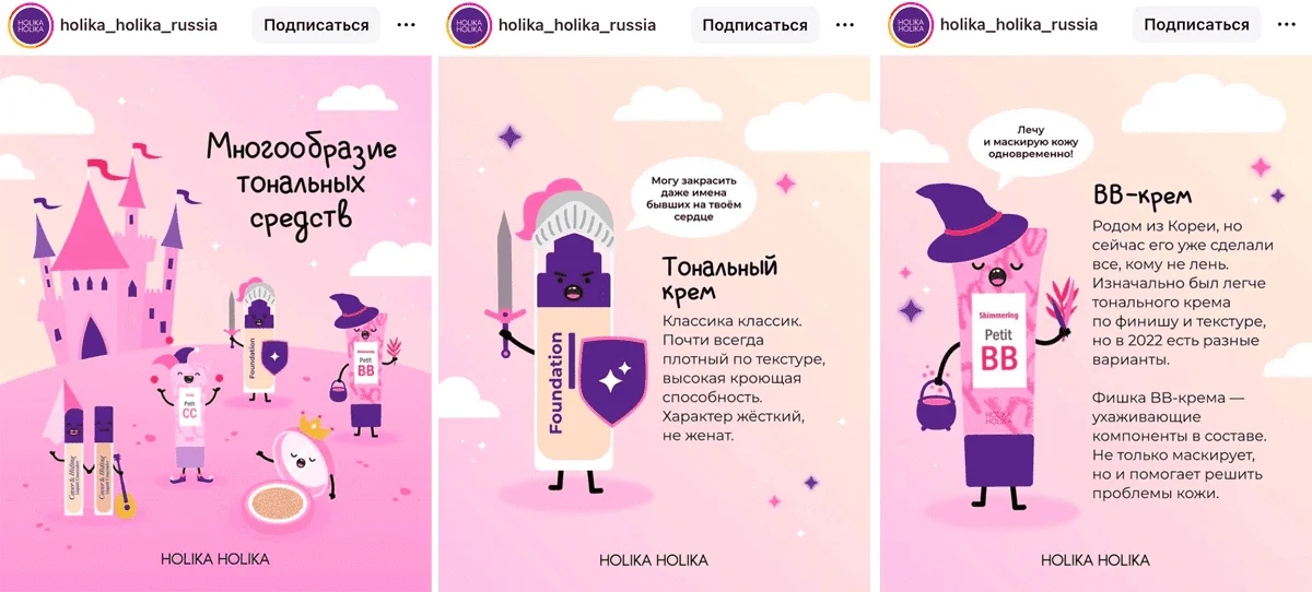 Визуальная метафора — отличный способ привлечь внимание к постам бренда в ленте соцсетей. Этот приём особенно полезен, когда нужно объяснить разницу между продуктами. Например, бренд корейской косметики Holika Holika использует визуальные метафоры, чтобы объяснить разницу между тональными средствами: «волшебные» свойства BB-крема отлично переданы в образе колдуньи, а плотная и крепкая текстура тонального крема проиллюстрирована образом рыцаря с щитом.