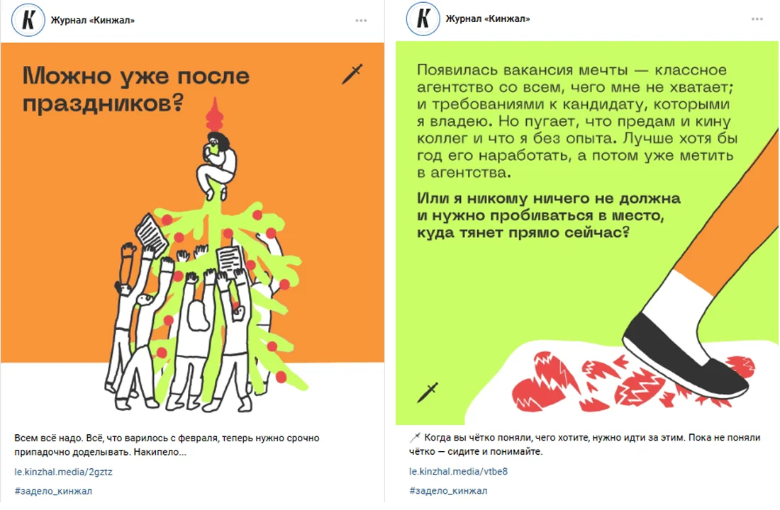 Журнал «Кинжал» о развитии soft skills часто использует визуальные метафоры в оформлении постов в соцсетях, тем самым увеличивая количество переходов по ссылке на статьи. Вот, например, в посте «Можно уже после праздников?» в ярком образе девушки на верхушке ёлки, которую донимают коллеги, считывается отчаяние и накопленная усталость. Это вызывает эмоциональный отклик и побуждает прочитать статью, чтобы найти в ней утешение. А разбитые сердца в другом посте ассоциируются с неудачами в работе, через которые герой буквально перешагивает.