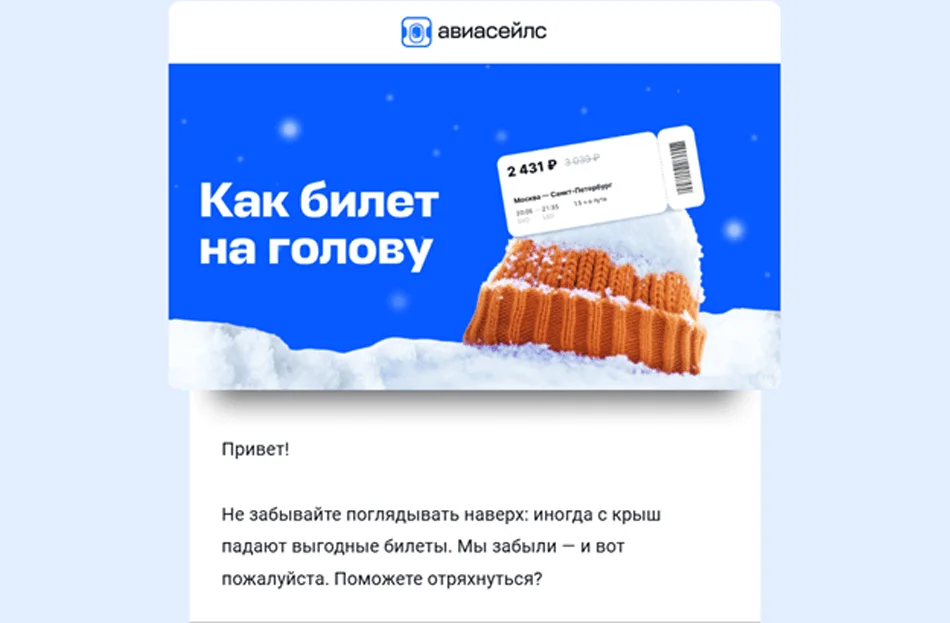Можно создавать сильный образ, сочетая языковую игру с визуальной метафорой, как это сделал Aviasales в своей email-рассылке. Чтобы напомнить клиентам почаще отслеживать выгодные авиабилеты на сайте, в компании зашифровали послание: билеты появляются как снег на голову — так же внезапно и неожиданно. Обыгранный известный фразеологизм подкрепили иллюстрацией с заснеженной шапкой и билетом на ней.