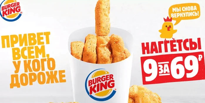 Метафоры незаменимы в юморе. Несколько лет назад Burger King и McDonald’s соревновались в троллинге друг друга. McDonald’s выпустил рекламу, где предлагал купить 6 наггетсов за 69 рублей. Ответ от конкурента не заставил себя долго ждать.