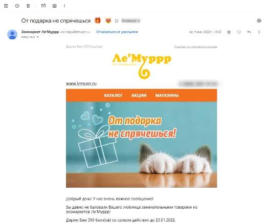 Классическое реактивационное письмо с предложением скидки и довольно стандартной темой письма, указывающей на наличие подарка («От подарка не спрячешься»). Внимания заслуживает заход в самом тексте: к покупателю обращаются не в контексте «Вы давно не тратили у нас свои деньги», а через питомца — ведь всем хочется побаловать его лишний раз. Такое обращение не вызывает раздражения, а скорее умиляет.