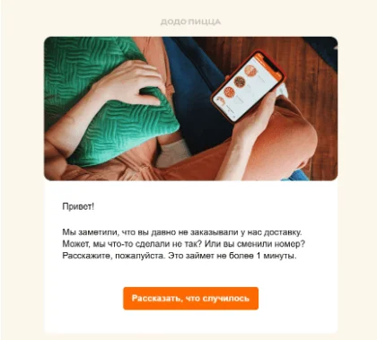 Маркетологи «Додо» обычно не скупятся на промокоды, но тут первым делом хотят получить фидбэк от клиента, которого теряют (кстати, тема письма ровно об этом — «Кажется, мы вас теряем…»). Если получатель заполнит форму — покажет свою заинтересованность, и его всё равно отблагодарят скидкой. Это ещё и экономно: замотивированный подписчик с большей вероятностью воспользуется промокодом и сделает заказ.