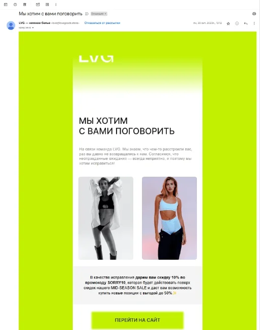 Ещё одна классическая, но хорошо разыгранная реактивационная история: интернет-магазин предлагает скидку по «извинительному» промокоду, признавая, что где-то допустили ошибку. Немного манипулятивно, но стоит отметить тему письма — она кажется очень искренней.