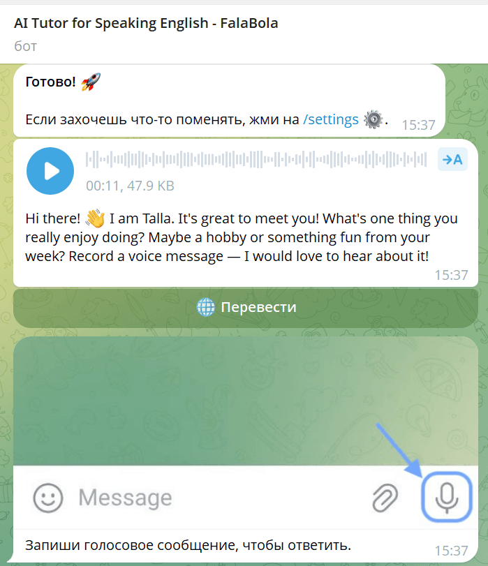 Telegram-бот хорошо подходит и для новичков: нейросеть подстраивается под уровень и темп обучения пользователя, голосовые сообщения легко расшифровать и перевести. Плюс можно изменить скорость речи.