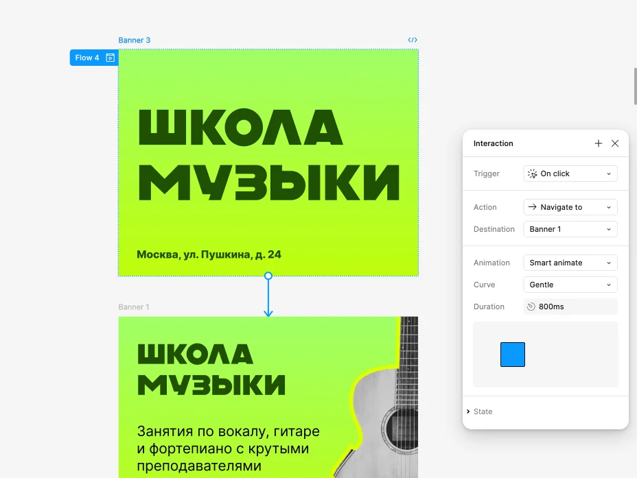 Шаг 3. Настройка анимации. Чтобы настроить анимацию, необходимо перейти в режим прототипа и соединить два фрейма. После нужно выбрать в выпадающем меню Smart Animate. Для более плавной анимации мы будем использовать тип Gentle и время 800 миллисекунд.