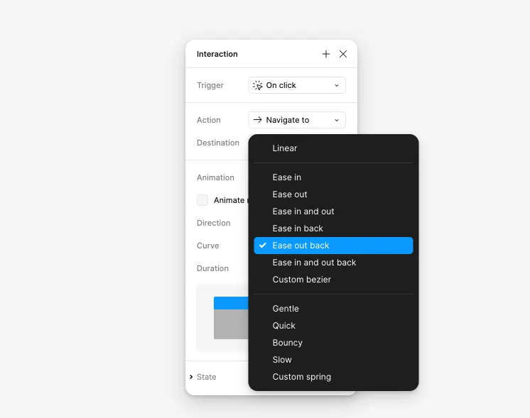 Плавность движений обеспечивают разные варианты замедления и ускорения в процессе. В жизни объекты редко перемещаются с одной скоростью, и в анимации принято делать процесс движения более сложным, естественным. В Figma для вас уже есть готовые настройки с ускорениями и замедлениями, их разработали профессионалы. Пробуйте, смотрите и выбирайте.