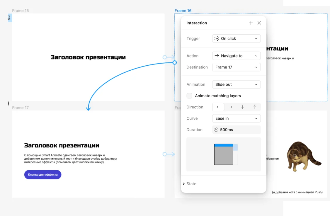 Когда дизайн готов, можно его «оживлять». Процесс аналогичен созданию анимированной презентации. Статичные элементы размещаются на фрейме, а анимация настраивается через наложение (Overlay) и переходы между фреймами. Для постов и сторис в социальных сетях отлично подойдут эффекты: