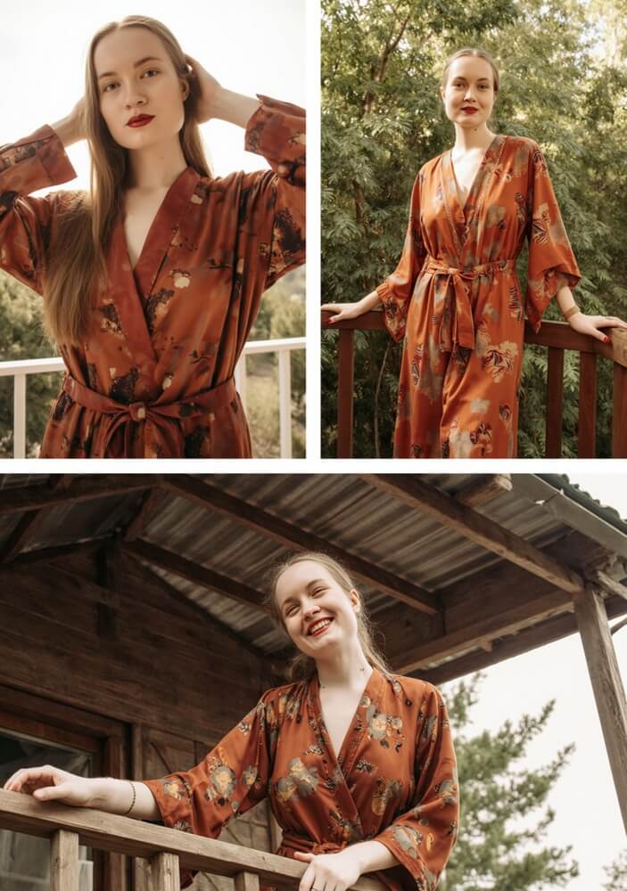 | C — Composition (композиция, образ героя) | The woman stands gracefully on the wooden balcony, both hands resting lightly on the railing. Her posture is relaxed yet upright, exuding quiet confidence. She looks directly into the camera with a composed, serene expression. The robe’s wide sleeves fall naturally, catching the warm sunlight and emphasizing the flow of the fabric. | Женщина стоит на деревянном балконе, слегка опираясь обеими руками на перила. Ее поза прямая, но расслабленная, в ней ощущается уверенность и внутреннее равновесие. Взгляд направлен прямо в камеру — спокойный и собранный. Широкие рукава халата свободно спадают, отражая теплый солнечный свет и подчеркивая плавность линий ткани. |
