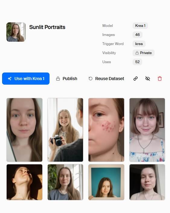 Когда обучение закончится, Krea автоматически создаст первые кадры с вашим лицом. Если результат не устроит, можно удалить часть фото и сделать новые — запустится переобучение модели.