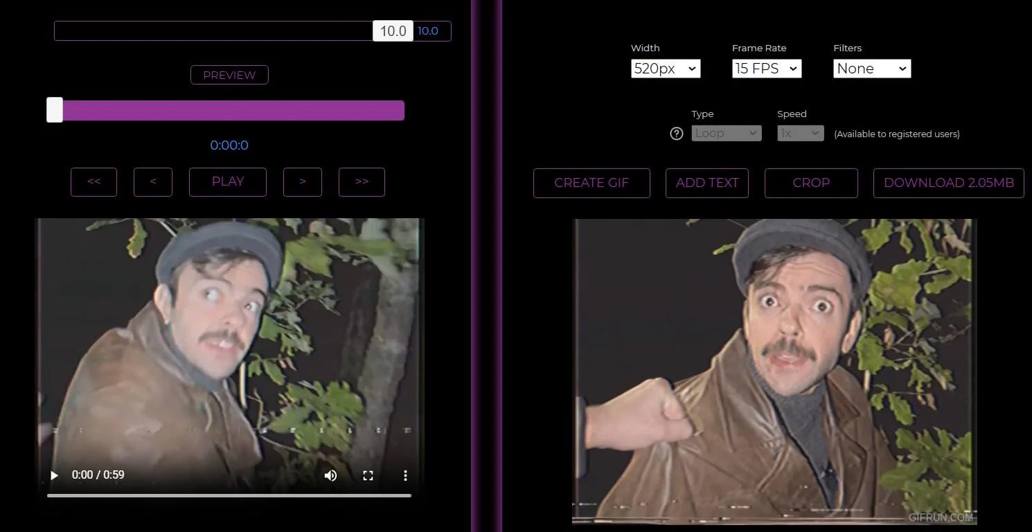В программе можно редактировать гифки, например, задать время начала и окончания, размер, добавить текст, настроить скорость воспроизведения, добавить логотип или водяной знак.