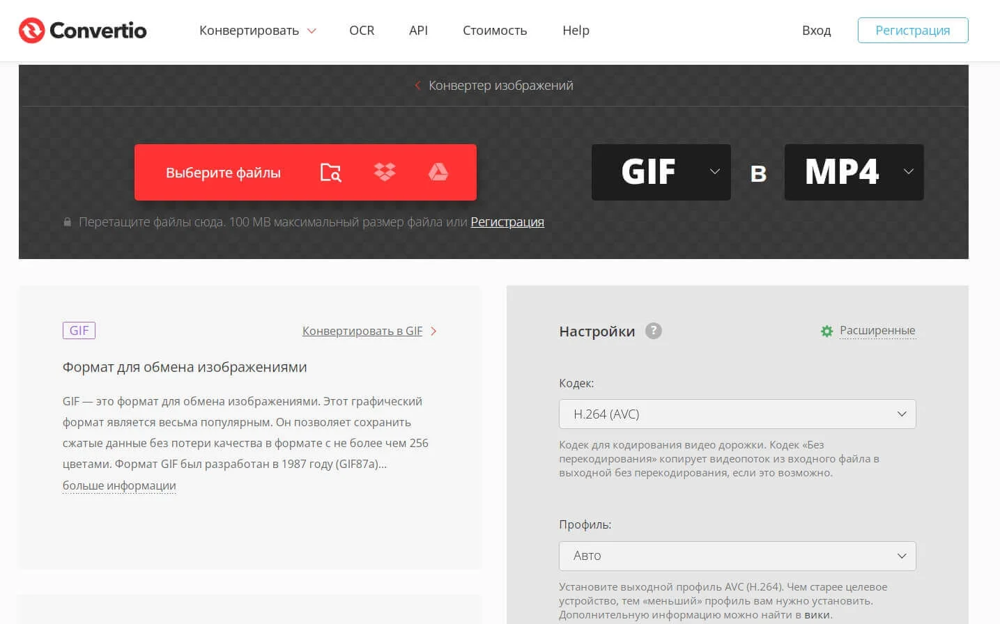 Convertio. Бесплатный онлайн-конвертер видео, но можно загружать файлы размером до 100 МБ. Чтобы загружать больше, нужна платная подписка — она стартует от $10 в месяц. Язык — русский.