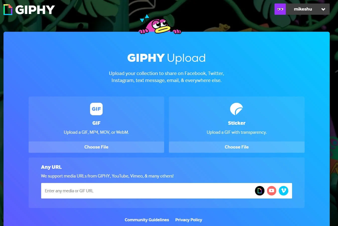 Можно загружать и редактировать уже готовые GIF-изображения. Например, чтобы поделиться гифкой по ссылке, вставить код на сайт, расшарить в соцсетях. Для этого переходим в раздел Upload и следуем инструкциям.