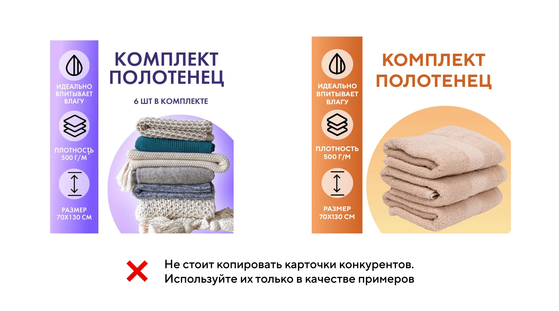Изучите карточки конкурентов. Проанализируйте, какие решения используют ваши конкуренты в своей инфографике, оцените их эффективность и подумайте, как можно выделиться на их фоне. При создании своей карточки важно не повторять инфографику конкурента, а лишь использовать приемы и детали, которые вам показались удачными.
