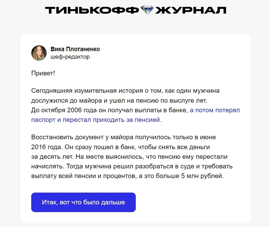 Или просто показать, что ждет человека в рассылке. Например, части письма показывает Тинькофф Журнал.