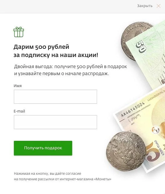 Такой приём часто используют магазины — предлагают получить скидку в 5–10% или купон на 300–500 рублей.