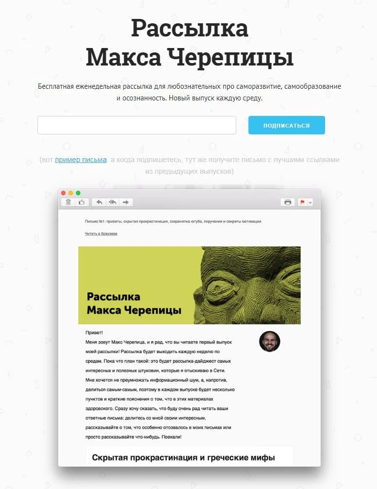 А Макс Черепица показывает один пример письма. И пишет, что сразу после подписки пришлёт подборку лучших выпусков. Так он создаёт интригу — выдаёт часть информации сразу + обещает что-то интересное сразу после подписки.