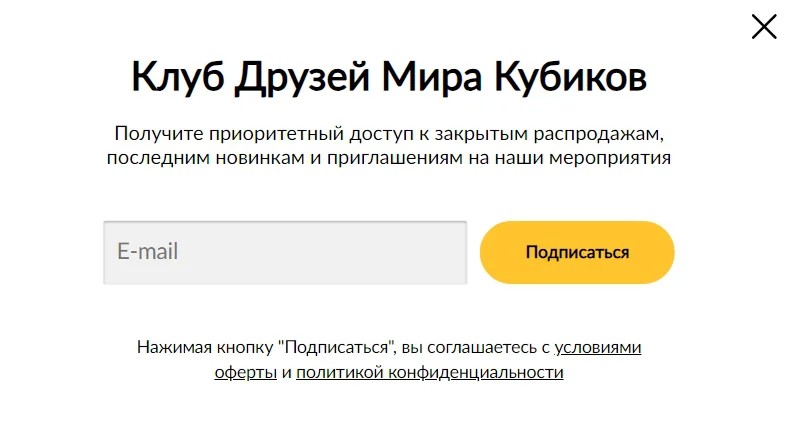 Онлайн-магазин детских игрушек «Мир кубиков» дает приоритетный доступ к закрытым распродажам и мероприятиям тем, кто подписался на их рассылку.