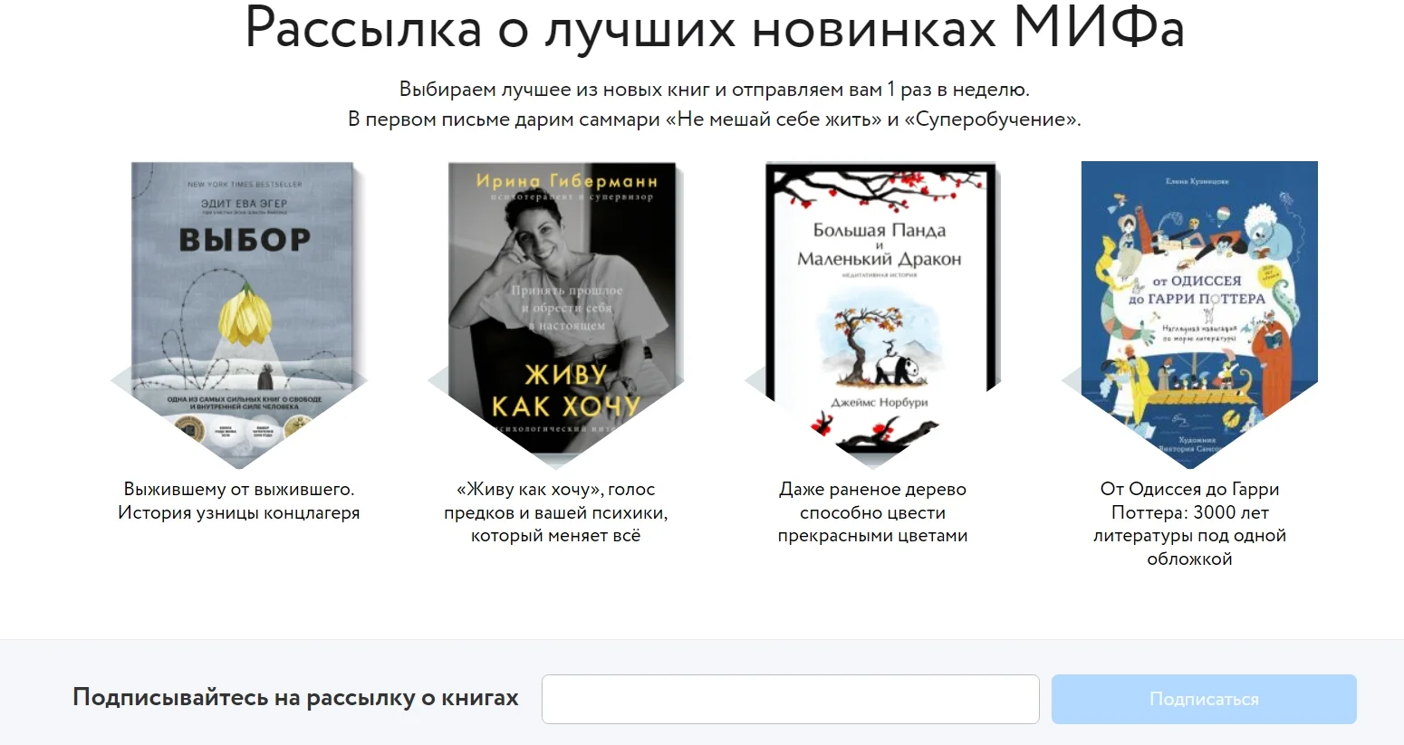 Обычно заголовок формы выглядит так: «Подпишитесь на рассылку и получайте новости первыми». Или «Подпишитесь и получайте полезные статьи раз в неделю, без спама».