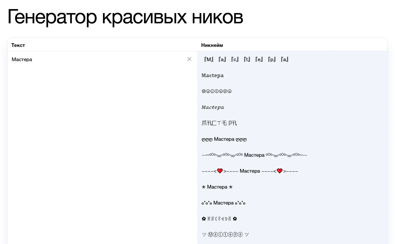 Если лень собирать слово вручную, можно обратиться к тому, что у Symbl называется «Генератор ников»: там достаточно ввести слово, и сервис предложит различные варианты написания — останется только протестировать, чтобы выбранный вариант точно сработал в почтовиках. С кириллицей тоже работает! Но сразу предупредим, что некоторые варианты выглядят, как будто вы вернули себе свой 2007-й.