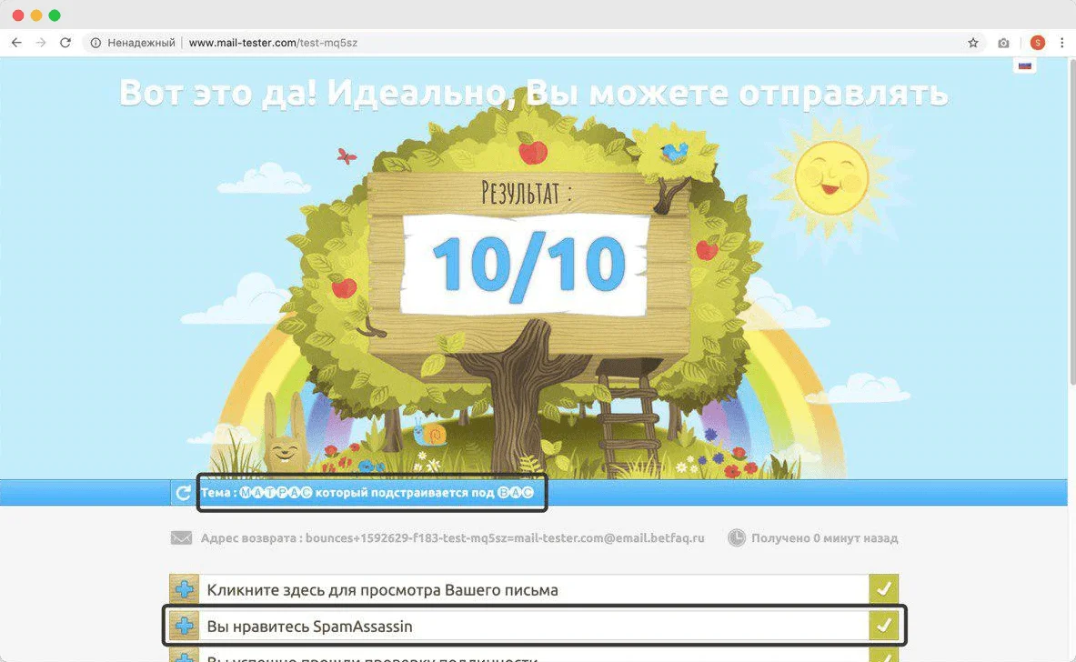 Я проверил письмо с Юникодом в сервисе Mail-tester. Декоративные шрифты никак не влияют не репутацию email: