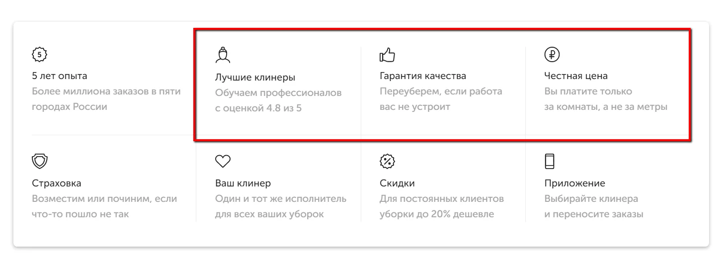 Выгоды для клиента. Такой блок описывает не характеристики продукта, а то, как он решает проблемы, закрывает потребности, избавляет от «болей».