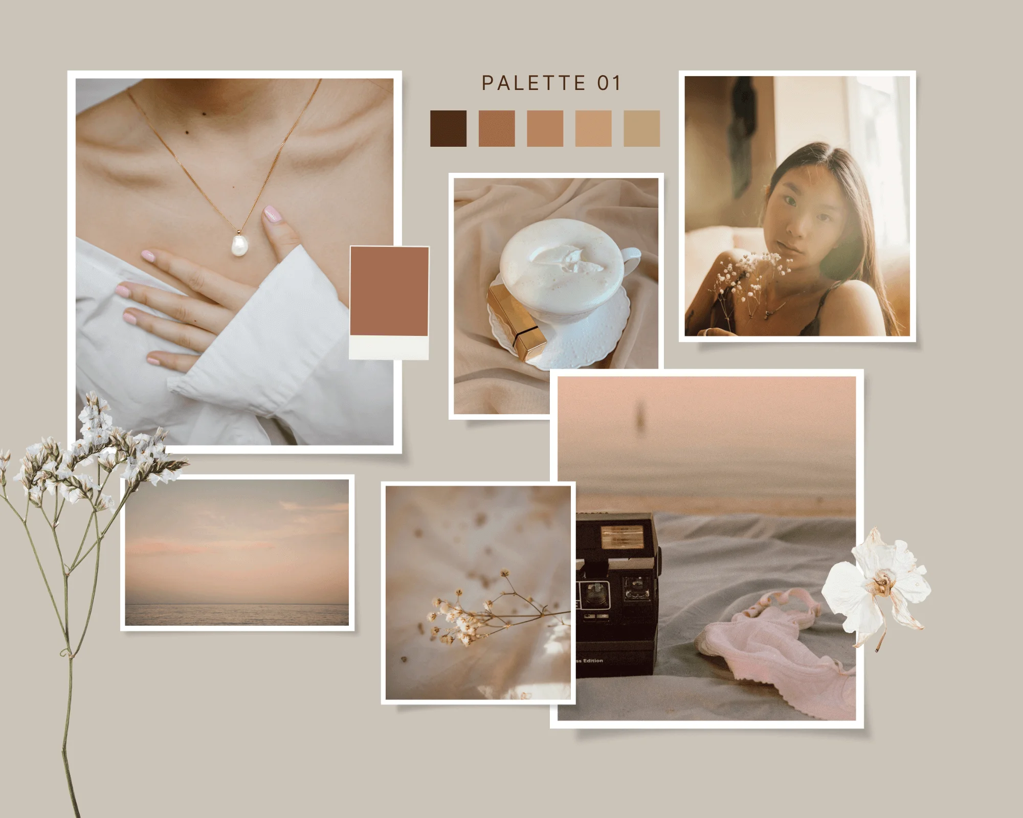 Главное — добавить в мудборд элементы, которые могут визуализировать идею проекта. К примеру, вот так может выглядеть доска, на которой показано цветовое оформление: