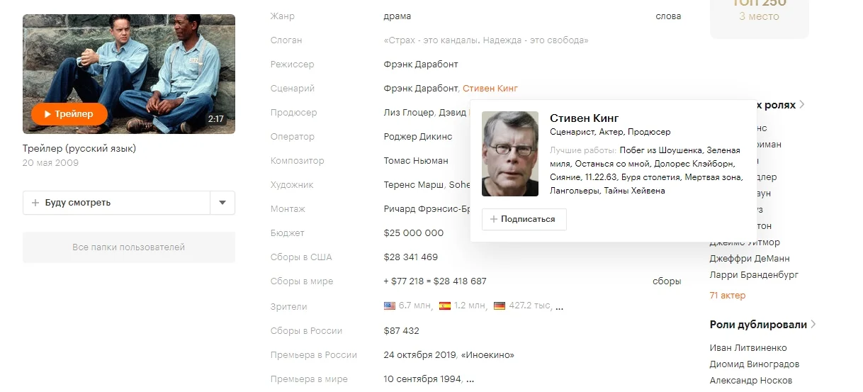 На «Кинопоиске» фильмы и люди, принимавшие участие в их создании, также связаны между собой ссылками. Возможно, поэтому биографии актеров на этом сайте всегда показываются в топе поисковых систем.