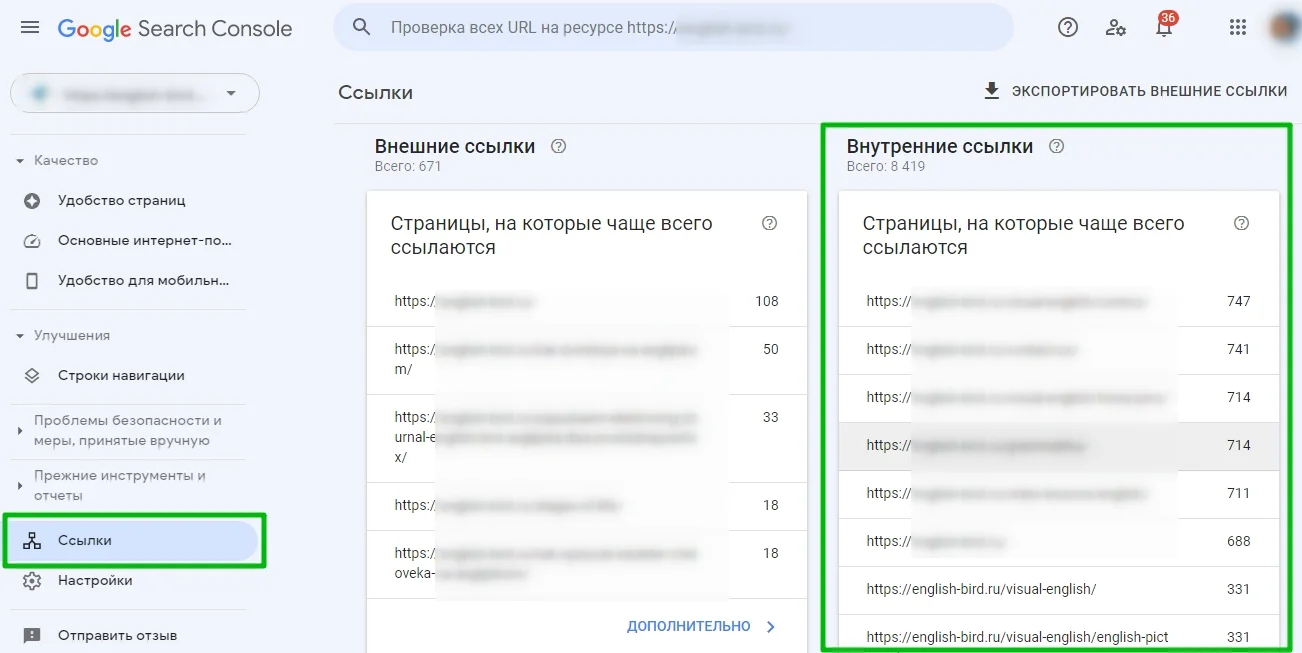 Ещё в Google Search Console есть специальный отчет «Внутренние ссылки». Здесь вы сможете узнать, на какие страницы часто ссылаются внутри сайта, а какие находятся практически вне досягаемости для пользователя.