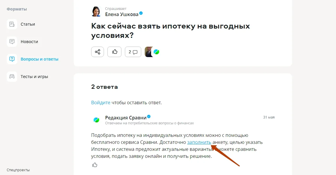 А вот не статейный пример. Раздел «Вопрос-ответ», который есть на многих сайтах, тоже может перенаправлять посетителей на нужные страницы.