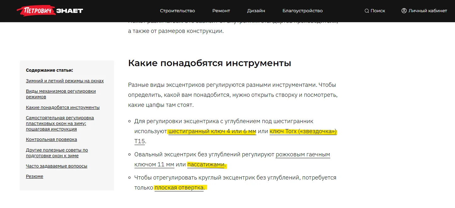 Лучший результат достигается, когда контент и ссылки работают вместе для решения задач пользователя. Пример ниже — статья в журнале о строительстве про то, как перевести пластиковые окна в зимний режим. Текст помогает человеку разобраться, как это сделать, а ссылки указывают, где найти необходимые для этого инструменты.