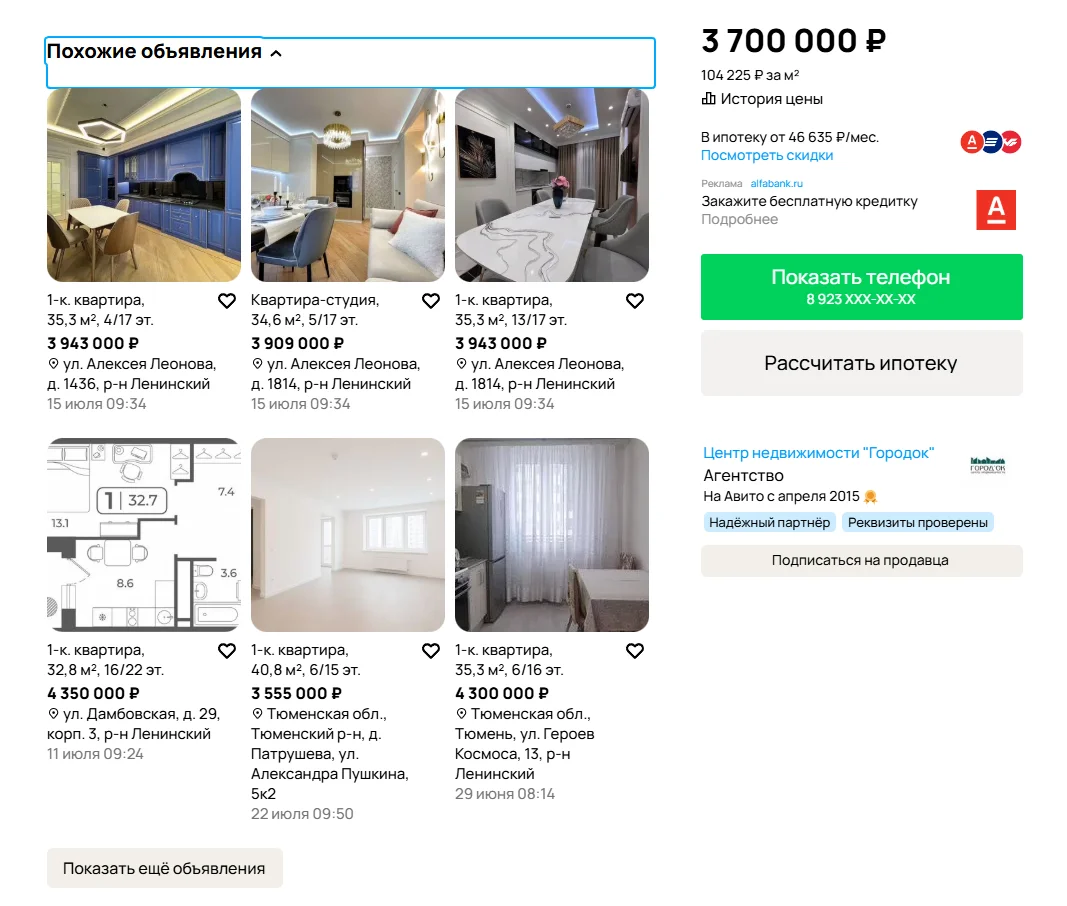 Сайт недвижимости — еще один пример удачного использования рекомендаций. В каждой карточке с описанием квартиры выводятся похожие предложения.