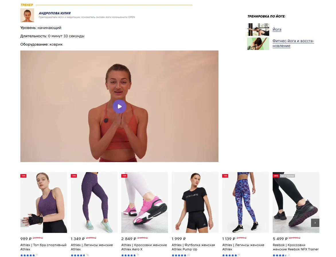 На сайте «Спортмастера» есть раздел с тренировками, где на каждой странице выкладывают видео. Внизу есть блок с одеждой/оборудованием для тренировки и ссылка на каталог товаров для фитнеса.