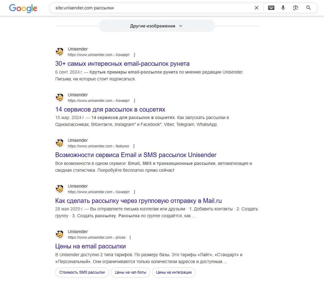 Google выдал результаты поиска из разных разделов сайта Unisender: услуг, базы знаний, блога и других. На первых позициях — самые релевантные и «жирные» (с наибольшим весом) страницы. Чем ближе страница-донор к топу, тем больше веса она будет передавать продвигаемой странице.