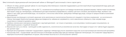 | 1–2 строки ценности | Коротко сформулируйте, какую задачу решает товар и кому он подходит | Вмещает большой объём воды и умеет поддерживать заданную температуру — подходит для большой семьи любителей чая или кофе |