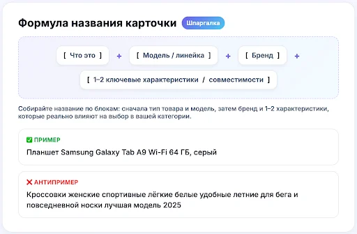 Название — первое, что видит покупатель в выдаче. Его задача — помочь быстро понять, что за товар перед человеком, и почему стоит открыть именно эту карточку. Хорошее название выглядит естественно: оно не перегружено словами и не выглядит как набор поисковых запросов.