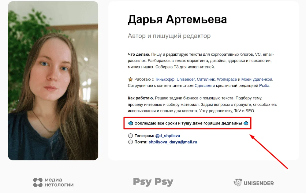 Пост о себе. Исполнитель может рассказать о своей работе в соцсетях, например ВКонтакте, Telegram или TenChat. А в тексте дать ссылку на визитку. В таком способе важно размещать разную информацию в посте и на сайте, чтобы пользователь не ощущал, что читает одно и то же.