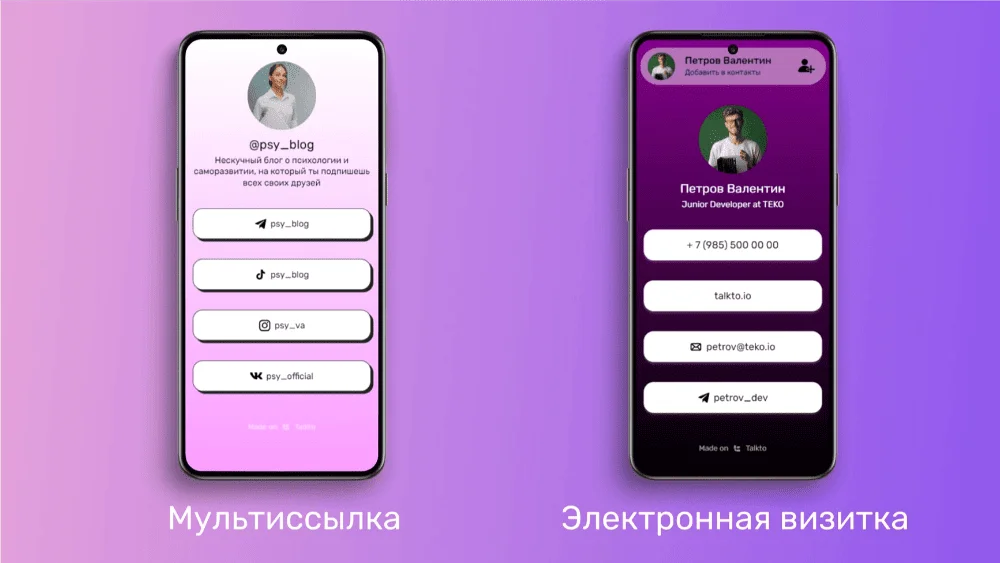Talkto. Сервис заточен под простые вертикальные сайты — с коротким описанием и контактами на мессенджеры. Готовой визиткой удобно делиться, если клиенты приходят через сарафанное радио — они уже знают лучшие кейсы и преимущества работы. Ресурс можно создать на сайте или через Telegram-бот Talkto.