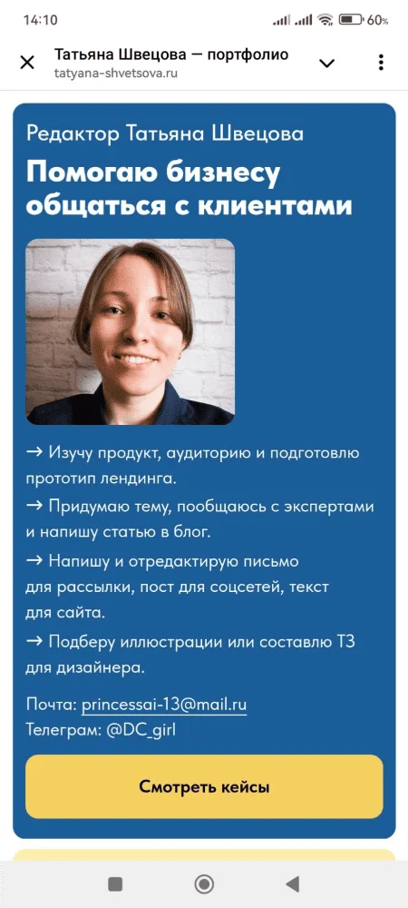 Объем. В отличие от привычных карточек-визиток, в онлайне можно добавить на сайт значительно больше информации о себе, а также загрузить видео или настроить анимацию. Стоит оставить больше свежих кейсов, которые покажут актуальный опыт.