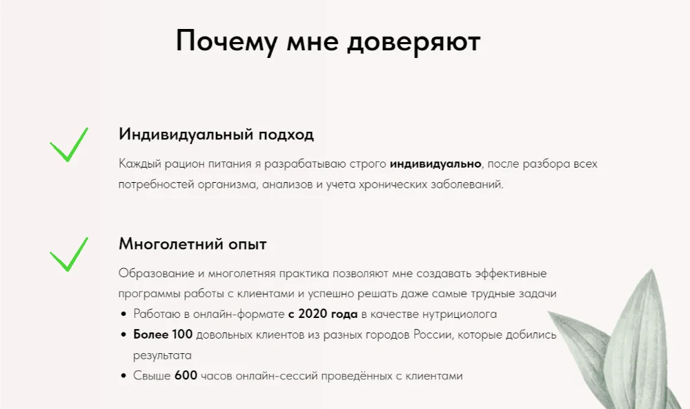 Отзывы клиентов. Впечатления о работе с этим специалистом или компанией. Лучше добавлять «живые» отзывы — больше доверия к тексту разной длины, с именем клиента и фотографией, незначительными ошибками.