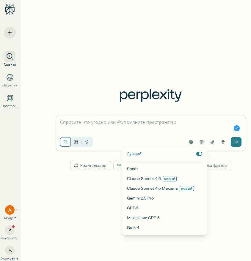 Perplexity. Это агрегатор нейросетей, в котором есть большое количество моделей: GPT-5, Claude Sonnet 4.5, Sonar, Gemini 2.5 Pro и Grok 4. Для доступа российским пользователям не нужно устанавливать сторонние сервисы, есть пробные бесплатные версии моделей.