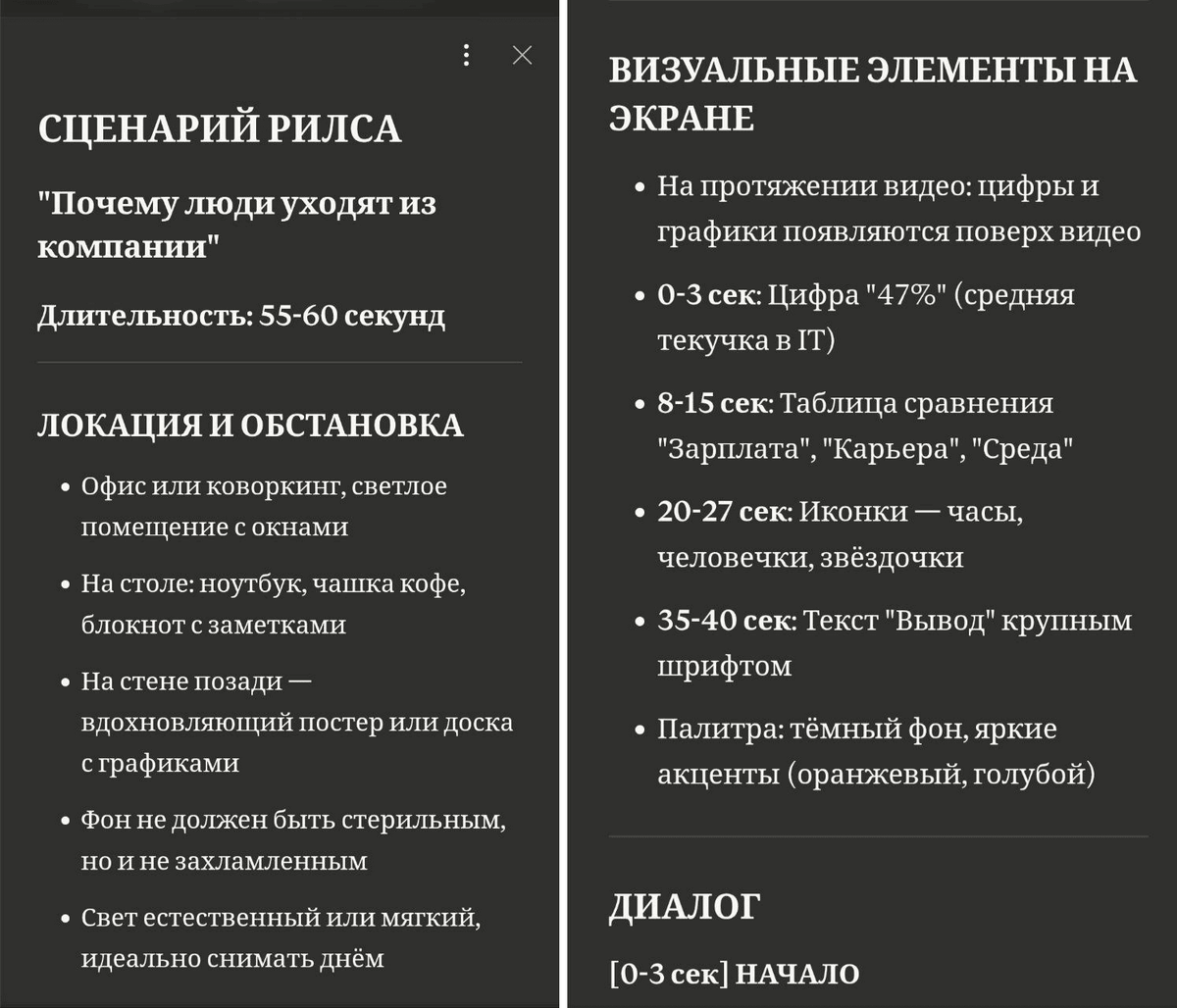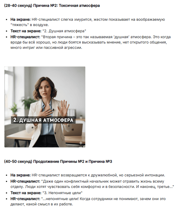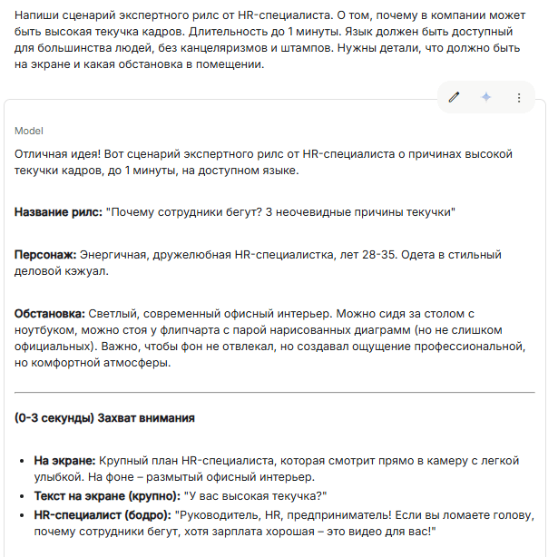 Gemini. Лучше всего с написанием сценариев справляется нейросеть от Google. Она не только генерирует структуру ролика, задает обстановку, пишет речь, но и создает визуальные референсы. По ним можно понять, как эксперт будет выглядеть в кадре и какой текст должен быть на первом плане. Правда пока русскоязычные надписи Gemini генерирует с ошибками.