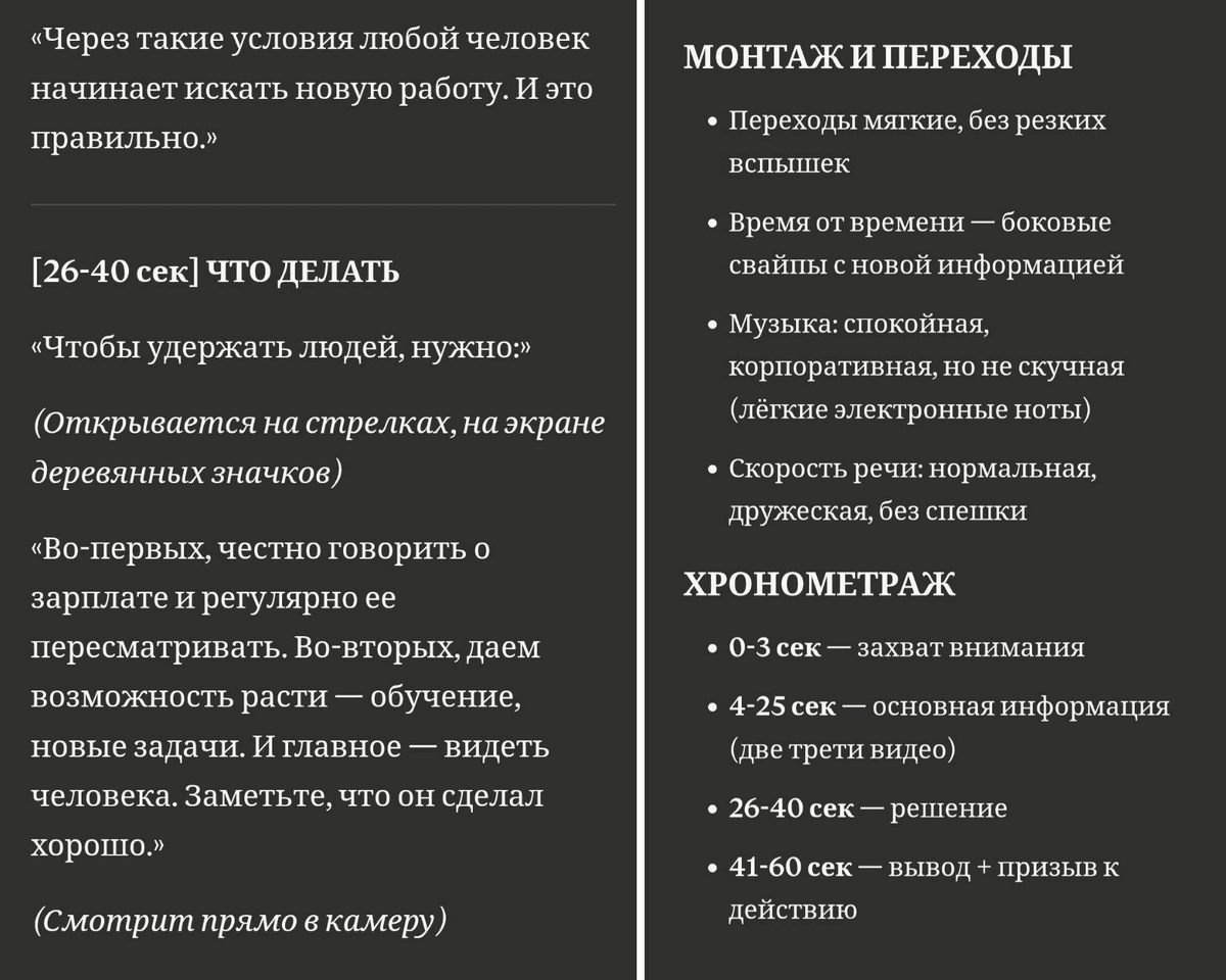 Формат результата. Для удобства можно попросить нейросеть представить результат в виде таблицы с колонками: «Хронометраж», «Видеоряд», «Текст на экране», «Дикторский текст или звук». Так не придется тратить много времени на редактуру и структурирование сценария.