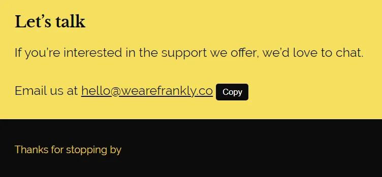 Mailtolink.me. Простой и минималистичный онлайн-сервис для создания Mailto-ссылок, ничего лишнего. Готовый URL не занимает много места и легко копируется в буфер обмена, но вот кнопка для копирования кода, похоже, не работает.