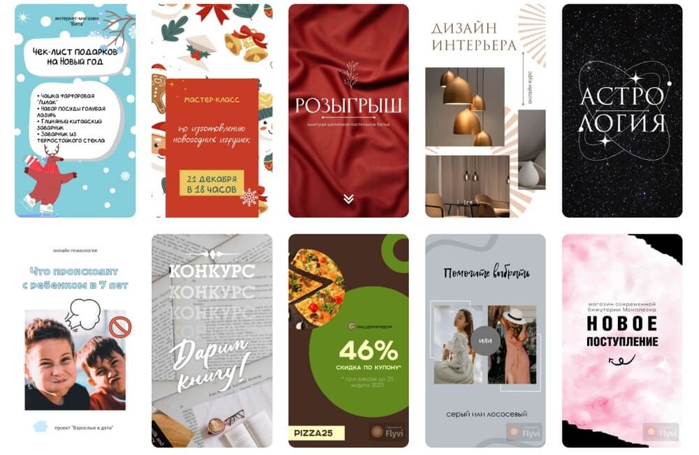 Flyvi. В простом графическом редакторе много готовых шаблонов для популярных сфер — косметики и моды, фитнеса, кафе, репетиторских услуг. В каждой карточке можно заменить шрифт, графический элемент. Например, перекрасить под стиль бренда.