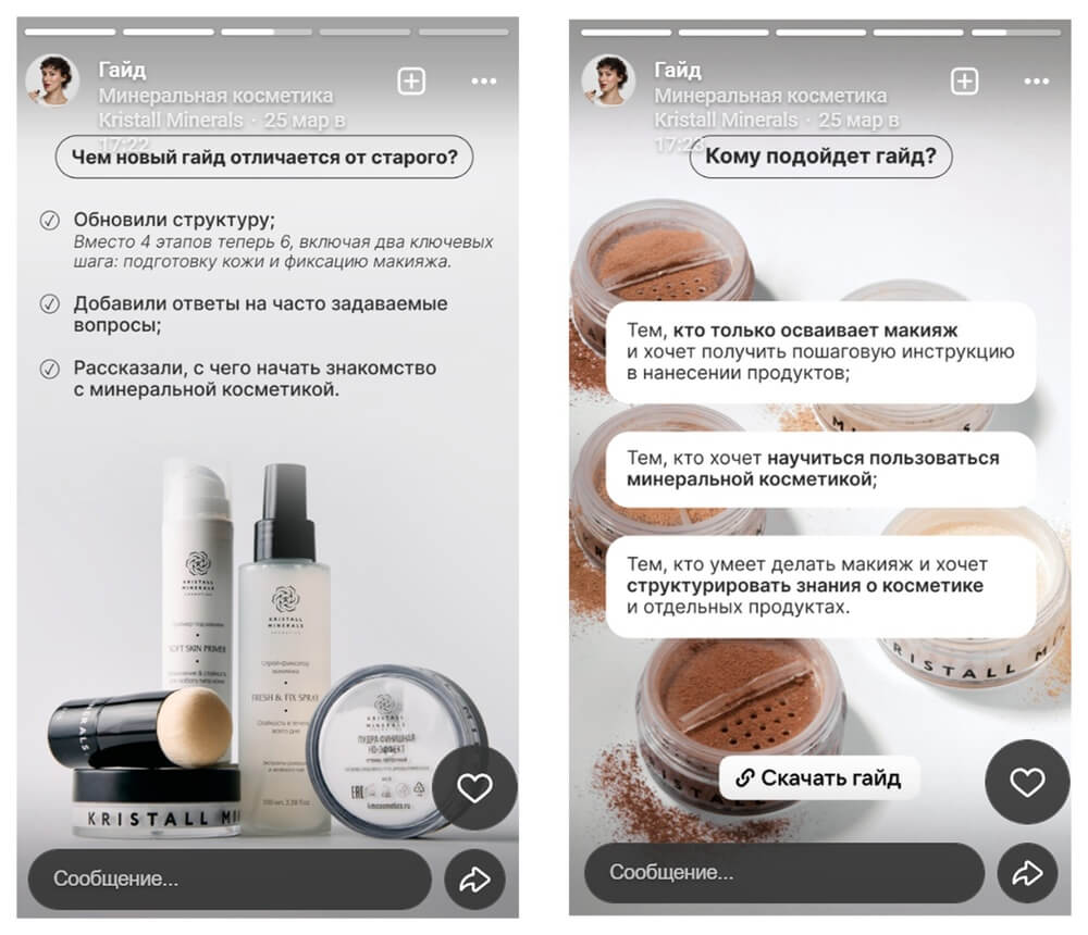 В некоторых сторис компании по шагам рассказывают, как пользоваться их продуктом. Такие карточки-инструкции оформляют в журнальной верстке — как печатные буклеты. Фото оказывается на заднем плане, а текст в виде «вопрос-ответ», чек-лист или прайс-лист занимает почти весь экран.