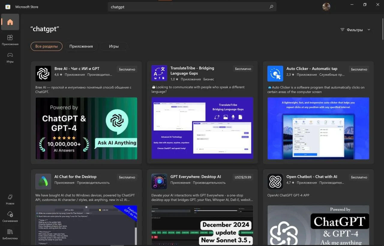 Перейдите на страницу OpenAI, где есть ссылки на приложения ChatGPT. Выберите For Desktop → Download for Windows. По клику откроется страница Microsoft store с официальным приложением, но по кнопке «скачать» вы загрузите не установочный архив, а файл-ссылку. По двойному клику этот файл переведет вас на ChatGPT в магазине. Можно его не скачивать и сразу нажать кнопку «Просмотреть в store».