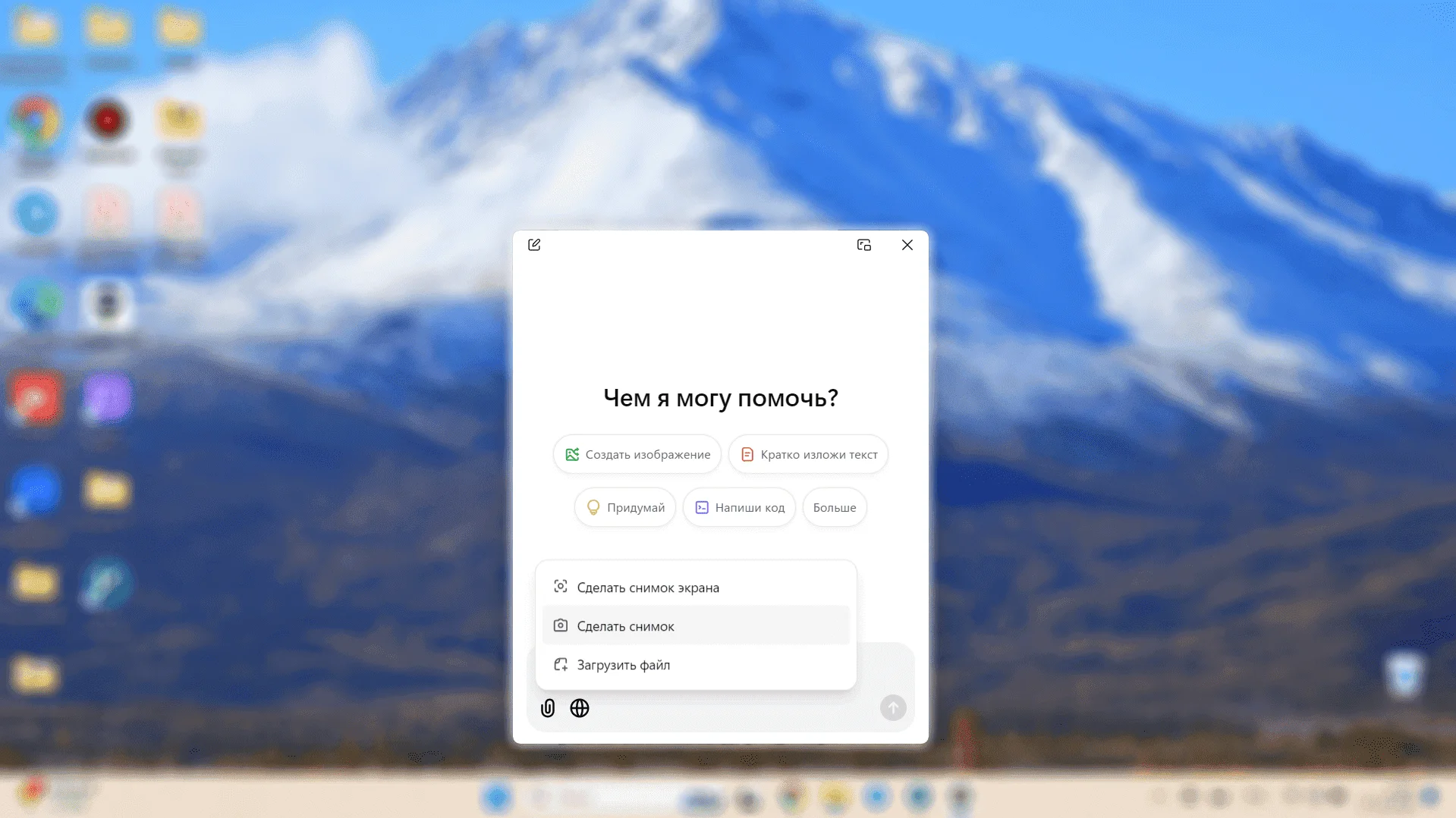 Создание фото и скриншотов. В диалоге с нейросетью можно загружать файлы, а можно сразу делать скриншот или фото с камеры и задавать по снимку вопросы.