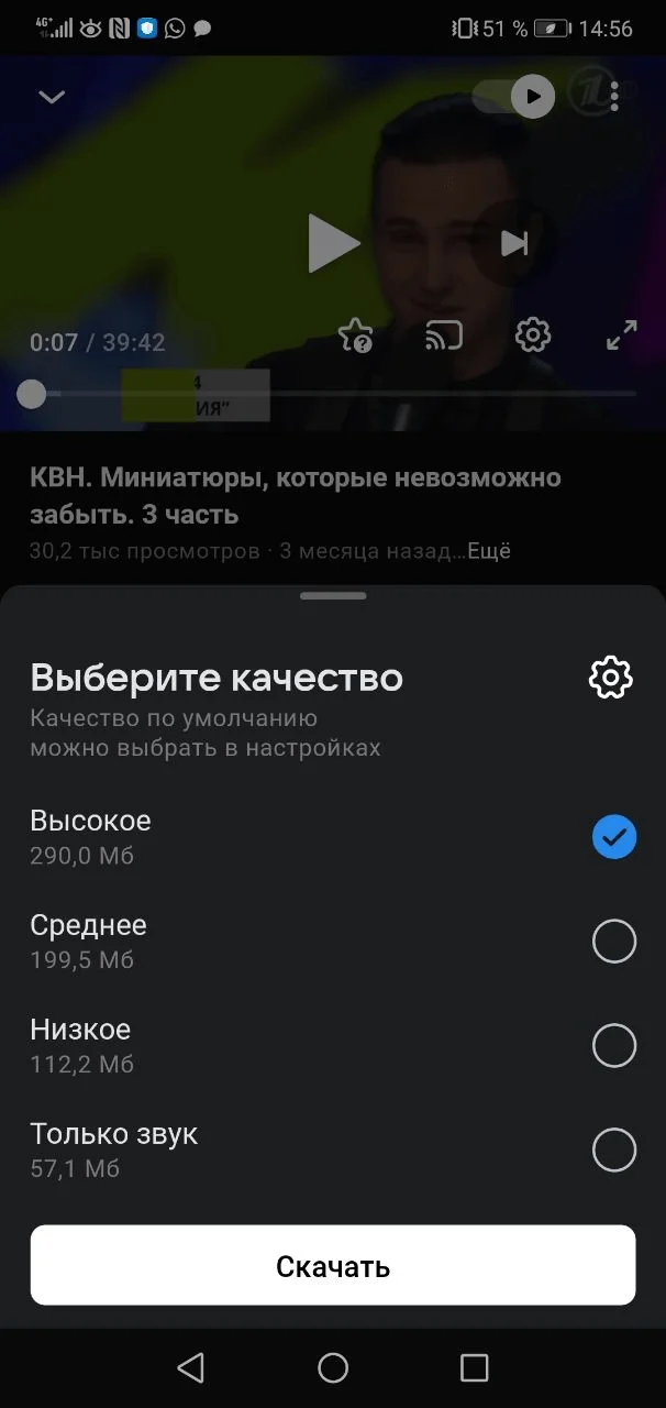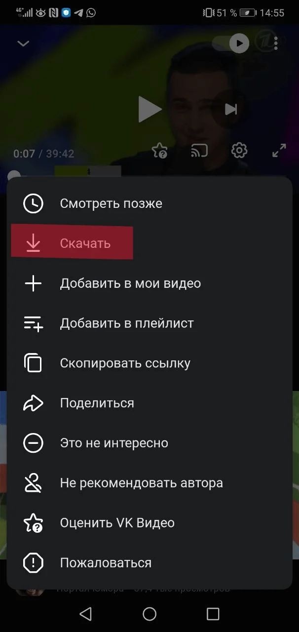 Видео можно скачать во внутреннюю память приложения. Чтобы сделать это, найдите ролик в приложении и нажмите на три точки в правом верхнем углу экрана. В выпадающем меню нажмите кнопку «Скачать».
