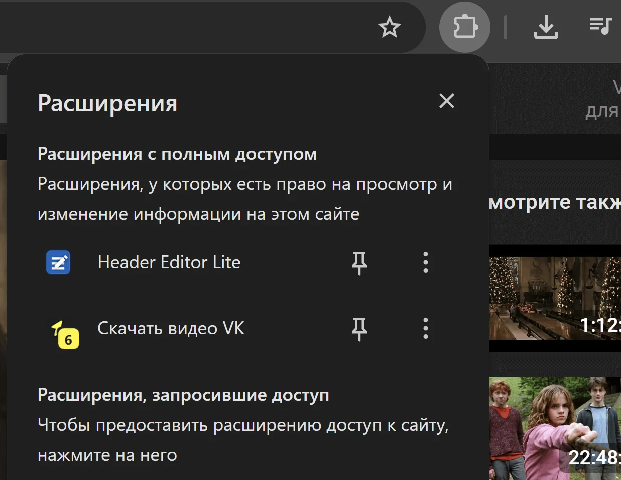 Плагин появится во вкладке расширений. Чтобы скачать видео, перейдите на страницу с открытым роликом и нажмите на иконку расширения.